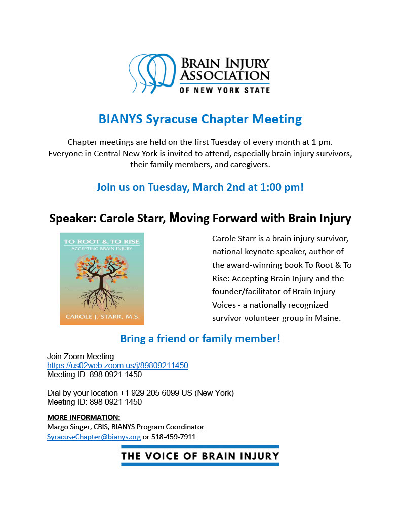 Carole Starr is a brain injury survivor, national keynote speaker, author of the award-winning book To Root & To Rise: Accepting Brain Injury and the founder/facilitator of Brain Injury Voices, a nationally recognized survivor volunteer group in Maine. Carole will be speaking on the topic of Moving Forward with Brain Injury. After her presentation, there will be plenty of time for Q & A with Carole.